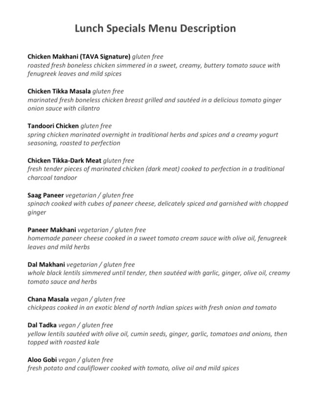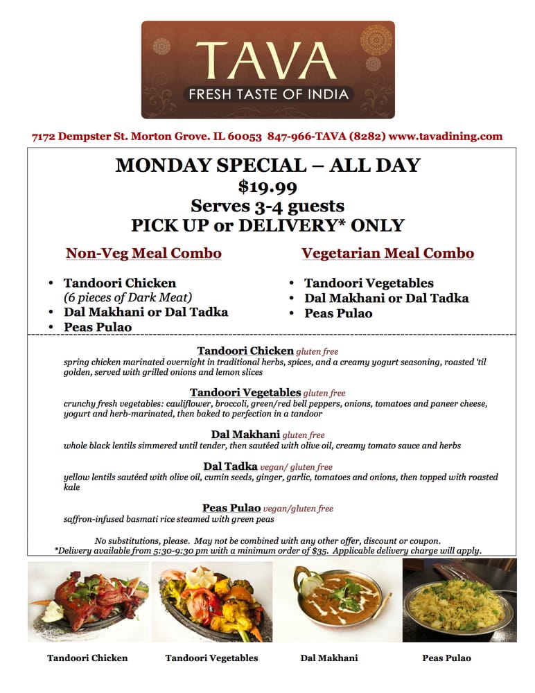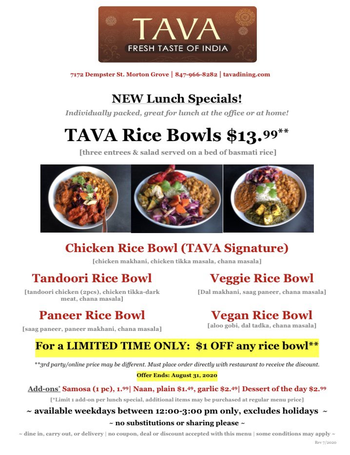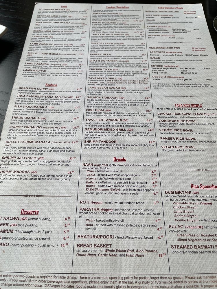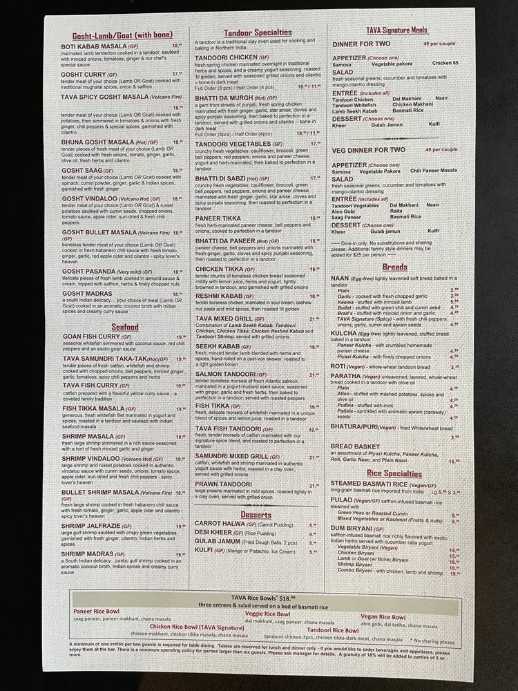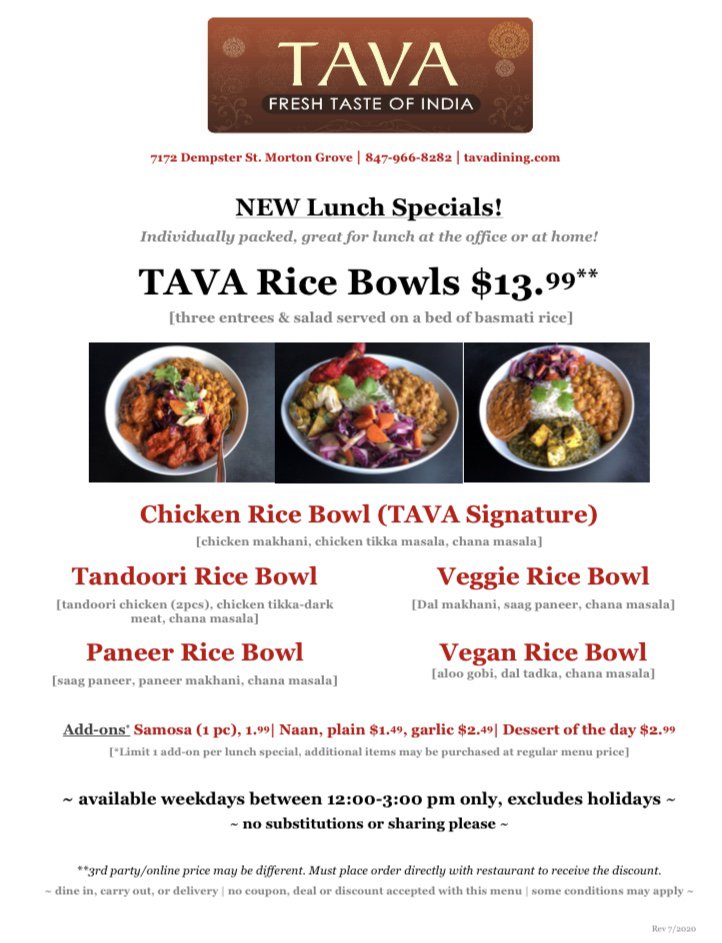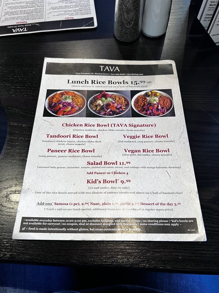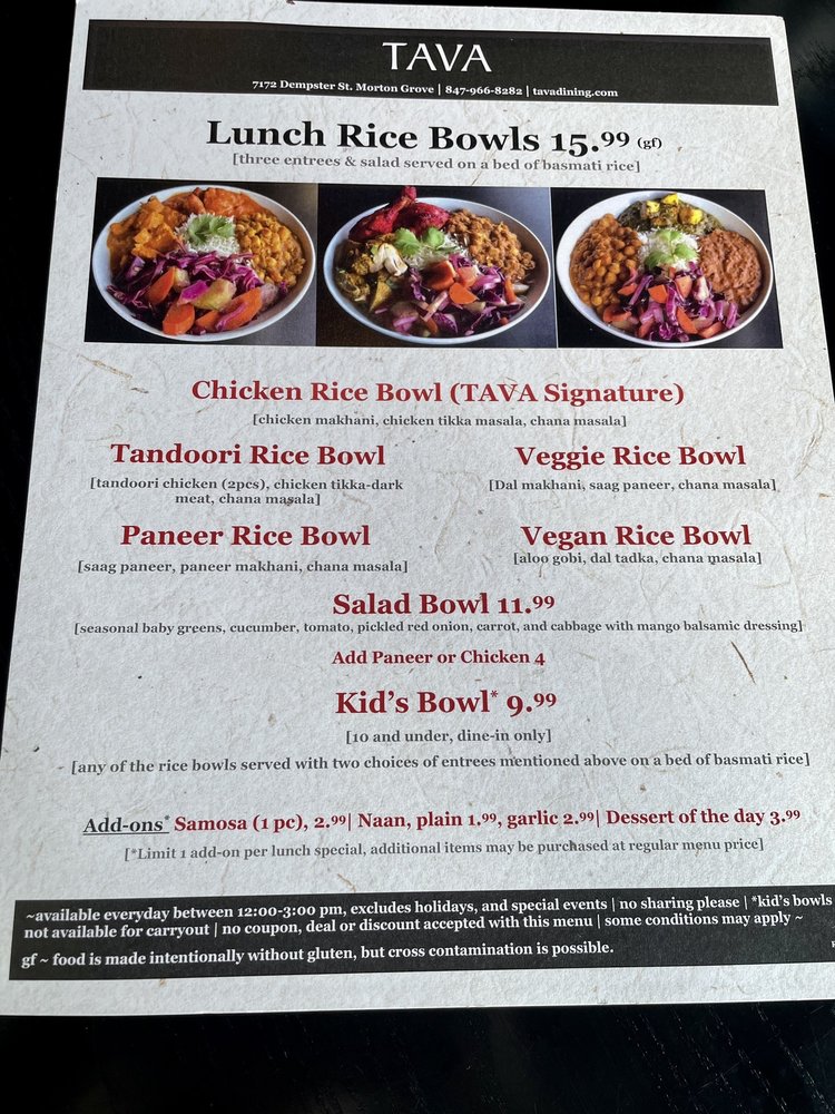 Introducing the menu at TAVA Fresh Taste of India in Morton Grove, IL, a vegetarian Indian restaurant that offers a wide range of vegan and pescatarian options. This classy establishment has a full bar, outdoor seating, and is Asian-owned. Customers rave about the excellent food quality, great lunch specials, and classy ambiance. The lunch special bowls are a highlight, with generous portions and beautifully presented dishes. The menu features a mix of traditional Indian dishes like tandoori chicken, butter chicken, and naan, as well as unique items like alcoholic lassi. Prices are on the higher end, but the high-quality ingredients and upscale atmosphere justify the cost. Overall, TAVA is a must-visit for those craving authentic Indian flavors in a sophisticated setting.